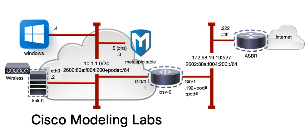 In this module, the goal is to break into the IOS iosv-r1 at the center of the network using TELNET and a locally configured username and password.